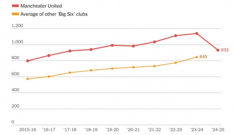全职职工减少了18%,但与其他Big6球队比拟后,拉特克利夫偏执团队觉得仍存在冗余空间。曼联上赛季的932名足球与行政东说念主员数目,高于其他5家俱乐部的平均值。
