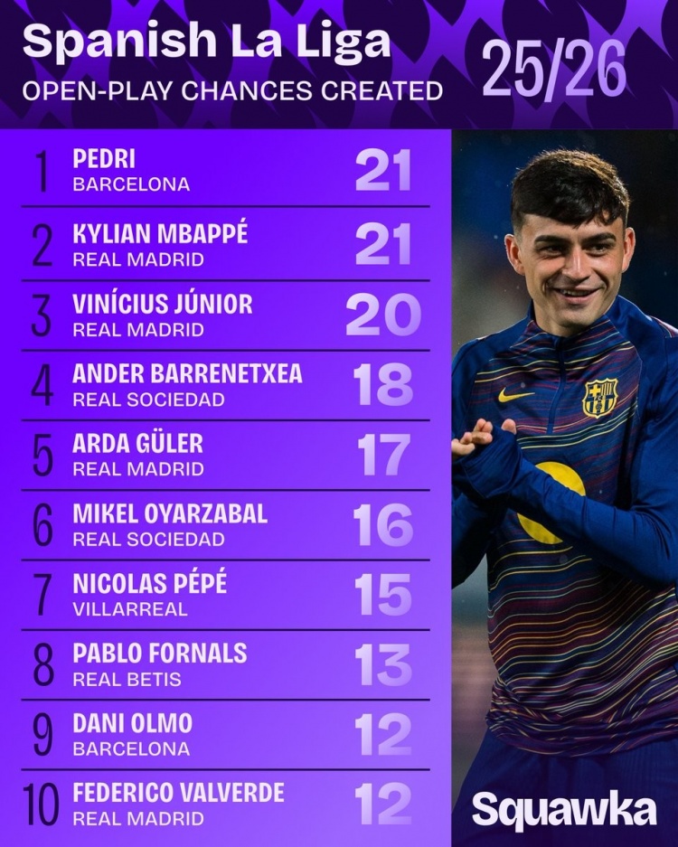10月16日讯 日前,Squawka统计了本赛季西甲领路战创造契机名次,