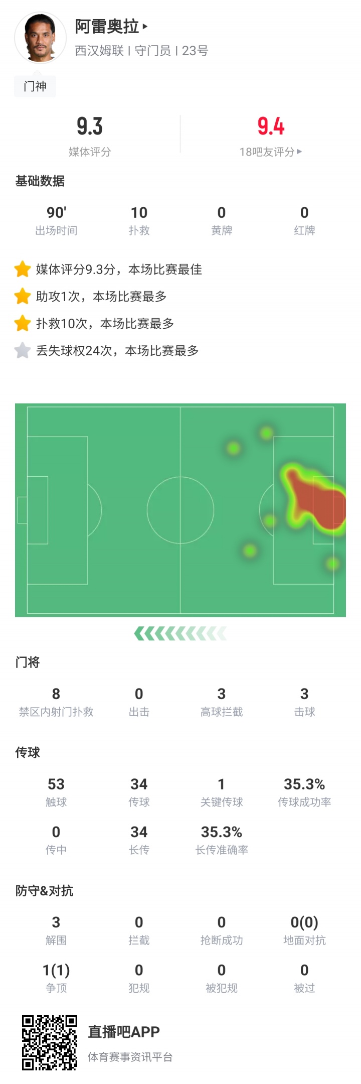 阿雷奥拉本场屡献神扑,险些个个是敌手近距离的射门↓