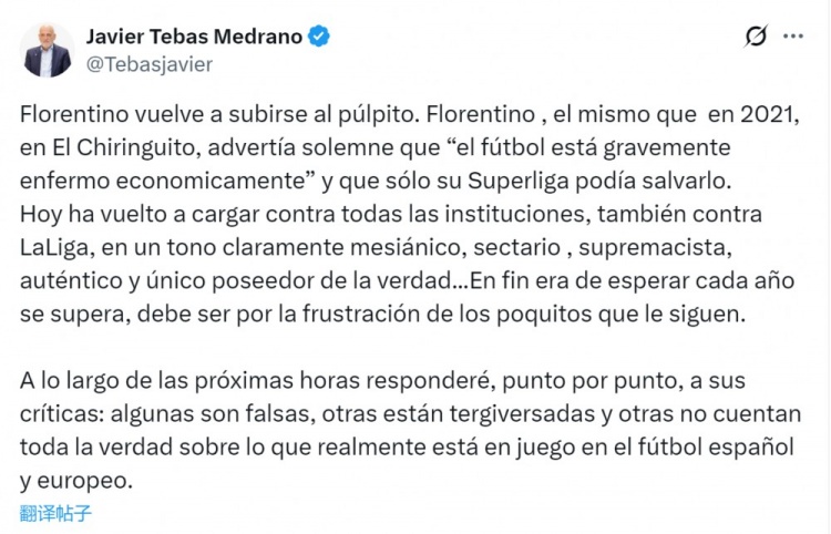 特巴斯社媒写说念:“弗洛伦蒂诺又启动高睨大谈了,恰是这位弗洛伦蒂诺,曾于2021年在西班牙六台节目中细心劝诫说‘足球正濒临严重的经济危急’,并声称惟有他的超等联赛才略扶植足球。