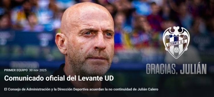 11月30日讯 莱万特本赛季14轮仅9分,现时位列西甲积分榜倒数第二。俱乐部官方晓喻,董事会与体育解决层已达成一致,朱利安·卡莱罗将不再担任男人一线队主老师。俱乐部官方声明如下: