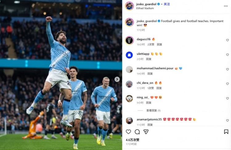 格瓦迪奥尔也在赛后通过社媒晒出我方的庆祝照,并配文:“足球会赐与你,也会指引你。一场紧迫的收效!”