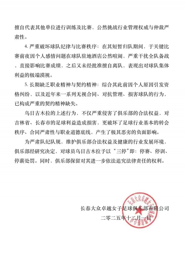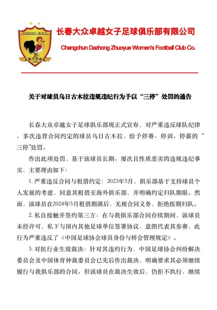 12月04日讯 女超俱乐部长春公共不凡女足发布处罚晓谕,女足国脚乌日古木拉被“三停”处罚,触犯5项违规违规。