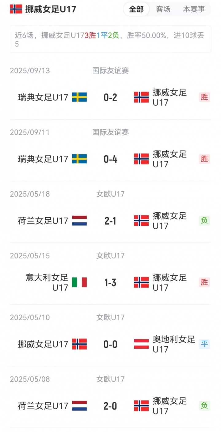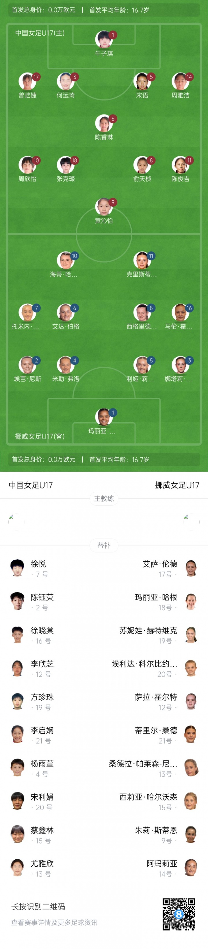 挪威U17女足首发:1-玛丽亚·埃莉斯·克罗肯、2-埃巴·尼斯、3-娜塔莉·斯凯德、4-米勒·弗洛、5-莉娅·埃林森、6-艾达·伯格、7-托米娜·恩格尔、8-西格丽德·加姆斯特、16-马伦·富格拉斯、10-海蒂·哈尔布迈尔、11-克里斯蒂娜·赫尔塞特