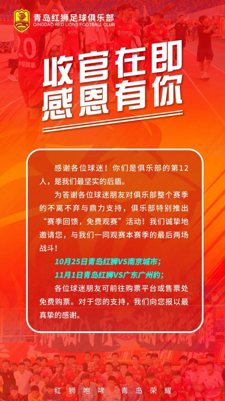 10月21日讯 中甲青岛红狮官方音书,球队本赛季终末两个主场比赛(别离对阵南京城市、广东广州豹)的门票免费。