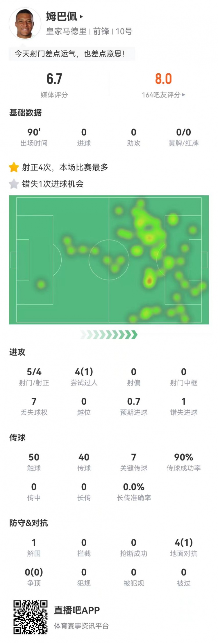 10月23日讯 皇马在本轮欧冠焦点战主场1-0小胜尤文,姆巴佩本场数据如下: