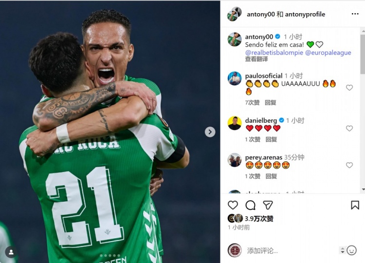 安东尼赛后在酬酢媒体上晒出庆祝进球的像片,配文:“在主场取胜太焕发了!”