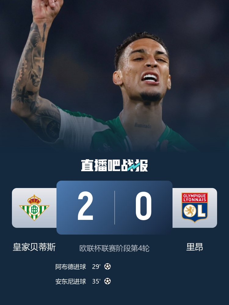 欧联杯联赛阶段第4轮比赛,皇家贝蒂斯主场迎战里昂,上半场比赛第35分钟,安东尼挑射破门,贝蒂斯2-0朝上。