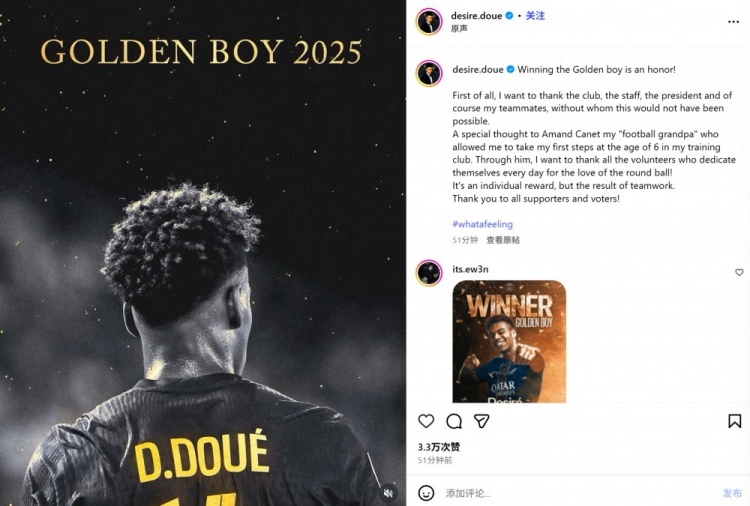 12月3日讯 在《王人灵体育报》垄断的欧洲金童奖授奖庆典上,杜埃领取了2025年金童奖杯。