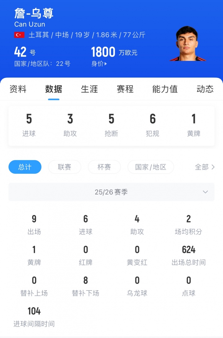 乌尊现年19岁,司职前腰,身高1.86米,法兰克福2024年破耗1100万欧将其从纽伦堡签下。本赛季,他为法兰克福出场9次,孝顺6球4助,他此前身价为1800万欧。