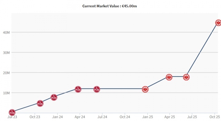 他与法兰克福的左券将在2029年到期,此前据德天外报说念,法兰克福为他标价8000万欧,已有多支英超球队挑升。