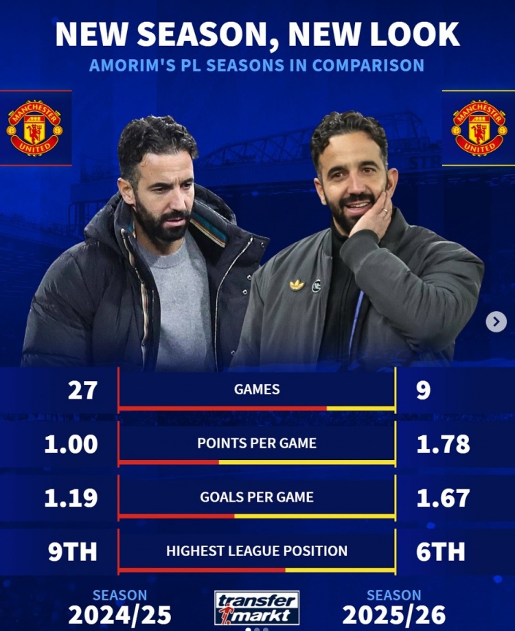 10月30日讯 阿莫林捏教的曼联在本赛季英超进展回暖,《转会市集》数据统计暴露也显豁好于上赛季。