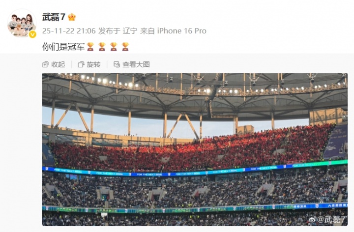 武磊晒出了末轮随海港远征客场的球迷角,况兼配文:“你们是冠军🏆🏆🏆🏆 ”。