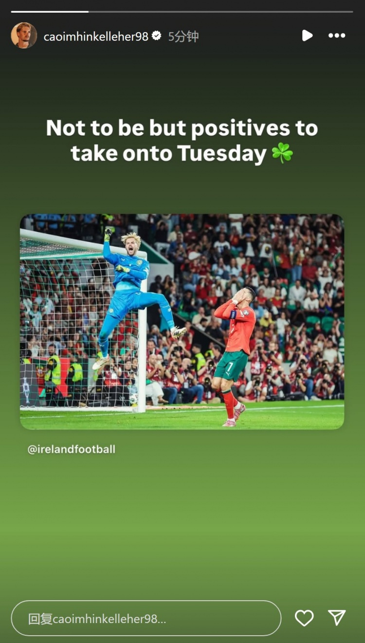 爱尔兰门将凯莱赫社媒晒扑出C罗点球后庆祝的相片,配文:“天然未能遂愿,但仍有积极成分不错带到周二的比赛之中(对阵亚好意思尼亚)。”