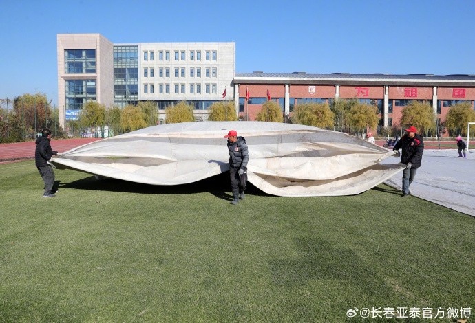 算作中超疆域最北端的城市,若何攻克严寒难关,保险自然草坪安全地渡过酷寒,持久是亚泰基地草坪养护团队的使命重心。本年,受状态影响,长春地区较往年同时明显偏低,为幸免低温对草坪变成毁伤,基地草坪养护团队将“盖被”使命提前启动,因为每年春天,自然草能否按时返青,返青后的助长,齐需要进行注目周密的呵护。