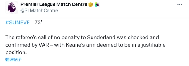 英超官方讲明:“裁判对桑德兰莫得点球的判罚经由了VAR的查验和阐发,因为基恩的手臂被以为处于合理位置。”