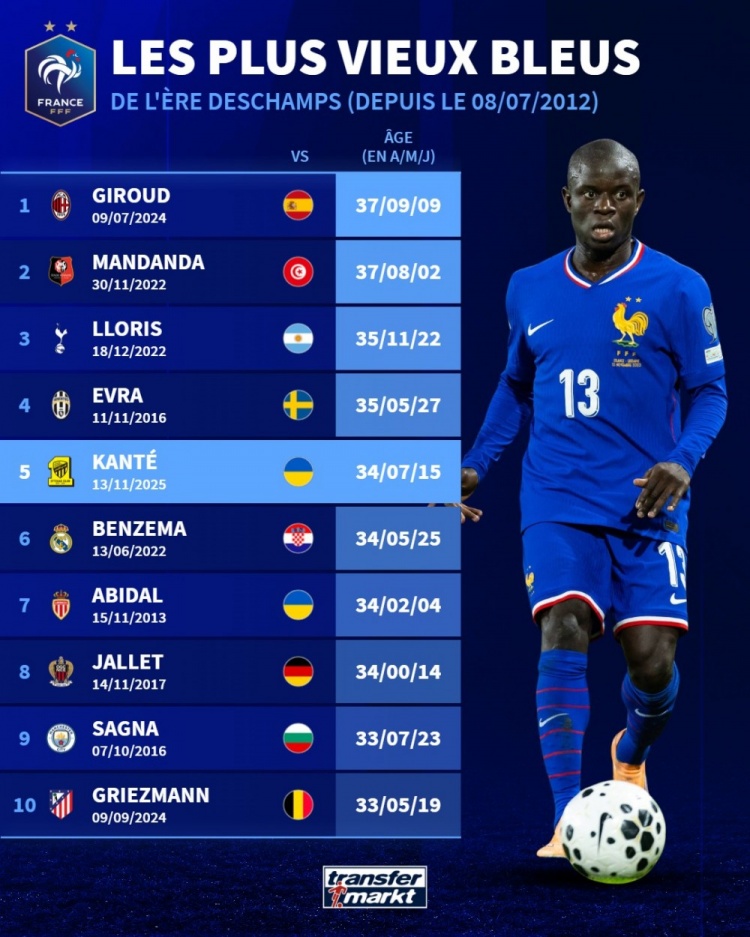 德尚麾下法国队年齿最大出场球员排行: