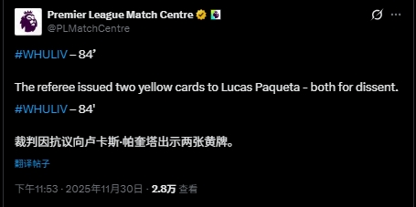 英超官方对此讲解:“主裁判因抗议判罚向帕奎塔出示两张黄牌。”