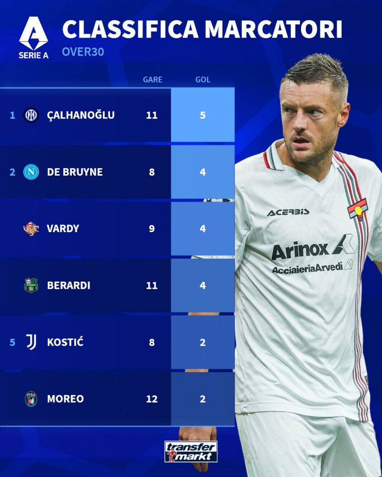 12月2日讯 德国转会市集统计了本赛季年事30+球员防御甲的进球数目,比肩出榜单,恰尔汗奥卢5球居首,德布劳内、瓦尔迪、贝拉尔迪4球。