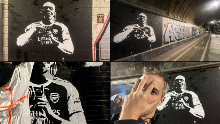 阿森纳街头艺术账号Northbanksy更新社媒,发布了新创作的壁画,埃泽身穿阿森纳球衣。