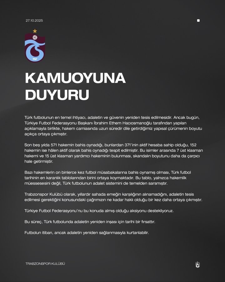 土耳其足球最根底的需求是重建正义和信任。然则,今天,土耳其足协主席易卜拉欣-埃特姆-哈奇奥斯马诺格鲁发表了声明,明晰地揭示了咱们长期以来在裁判界内所指出的结构性腐败程度。