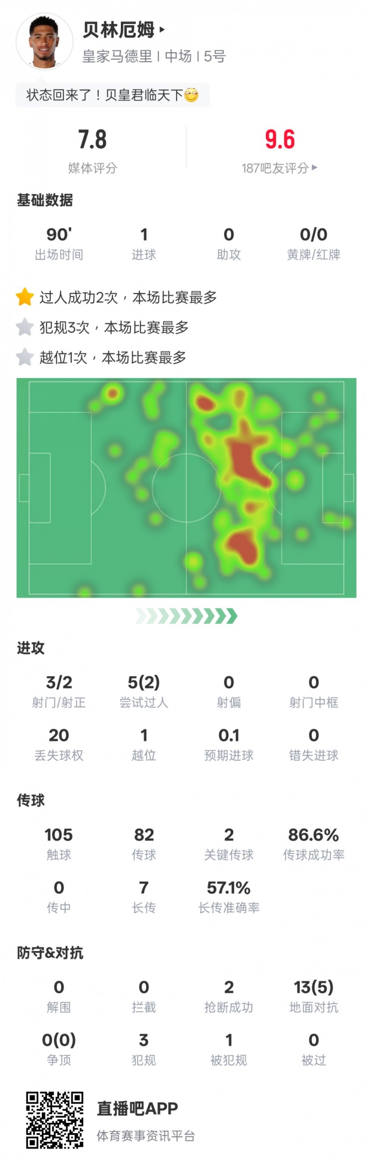 11月2日讯 2025-26赛季西甲第11轮,皇马4-0瓦伦西亚。贝林厄姆首发出战,打进1粒进球,送出2次要道传球,还有2次过东谈主成效和2次抢断,评分7.8。