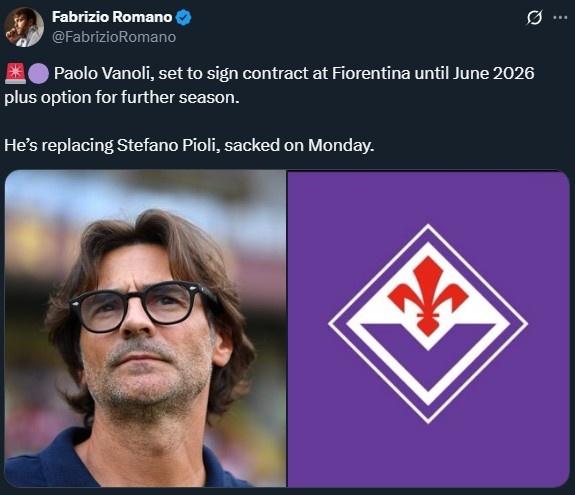 罗马诺暗示:“瓦诺利行将与佛罗伦萨签约,条约时限至2026年,含延伸一年的条件。他将取代周一被衔命的皮奥利,成为紫百合新帅。”