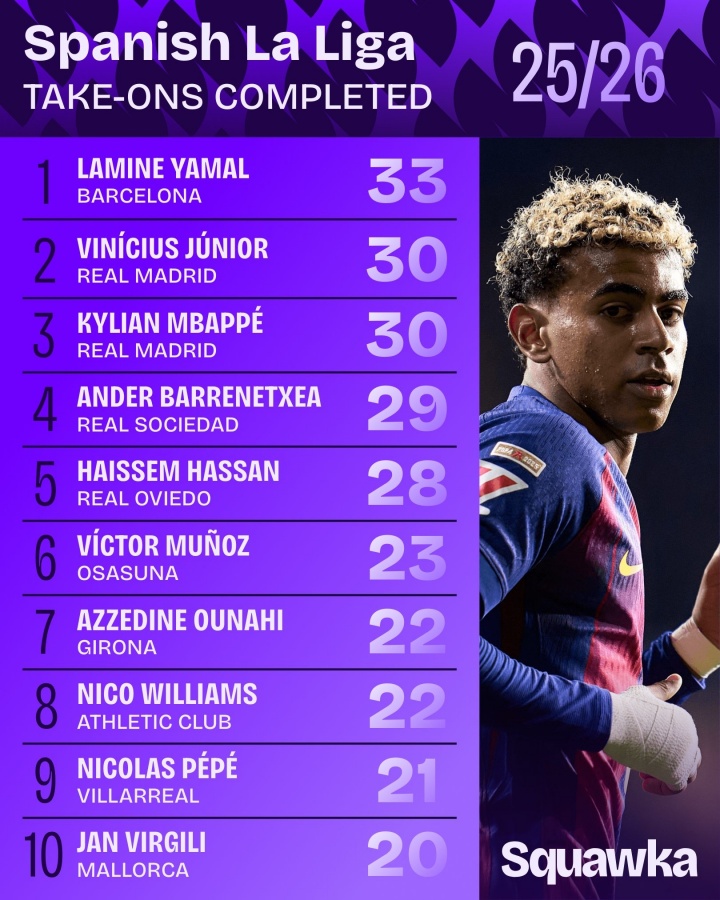 11月12日讯 巴萨亚马尔、皇马的姆巴佩和维尼修斯,他们在过东谈主冲破方面,王人有着不凡的禀赋。在2025-26赛季西甲联赛中,据Squawka数据统计,亚马尔在过东谈主次数排名榜单居首。