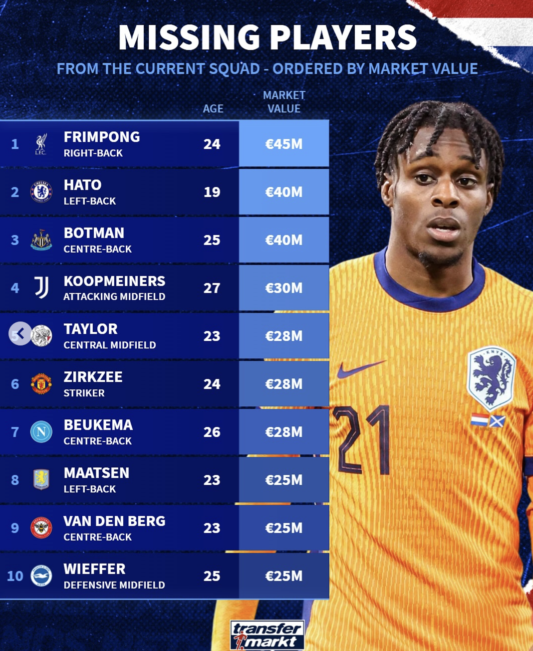 虎扑11月14日讯德转统计了落第本期荷兰队的球员身价榜。