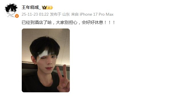 事情发生后,王年将成在今天凌晨更新微博,向外界报吉祥,默示“照旧到酒店了哈,大家别回想,会好好休息”。像片中不错明晰看到,王年将成的眼眶出现红肿,眉骨也已被包扎起来。