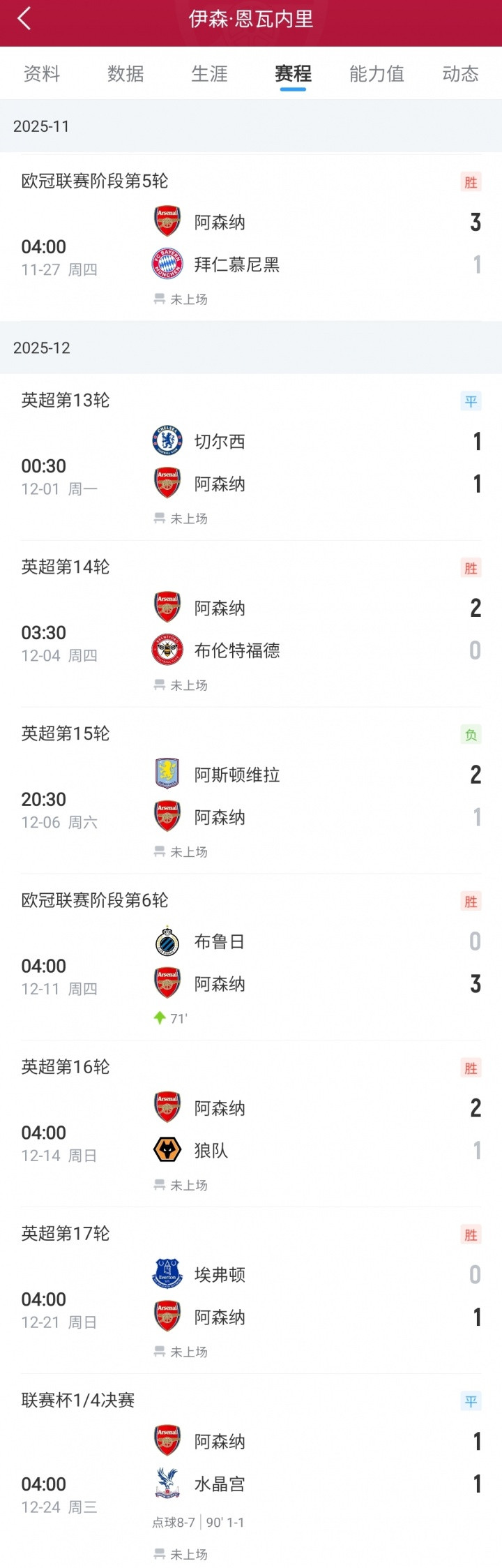 直播吧12月24日讯联赛杯1/4决赛,阿森纳点球大战打败水晶宫,18岁的恩瓦内里不绝闲坐板凳,近8场比赛,恩瓦内里仅代表阿森纳登场1次共19分钟。