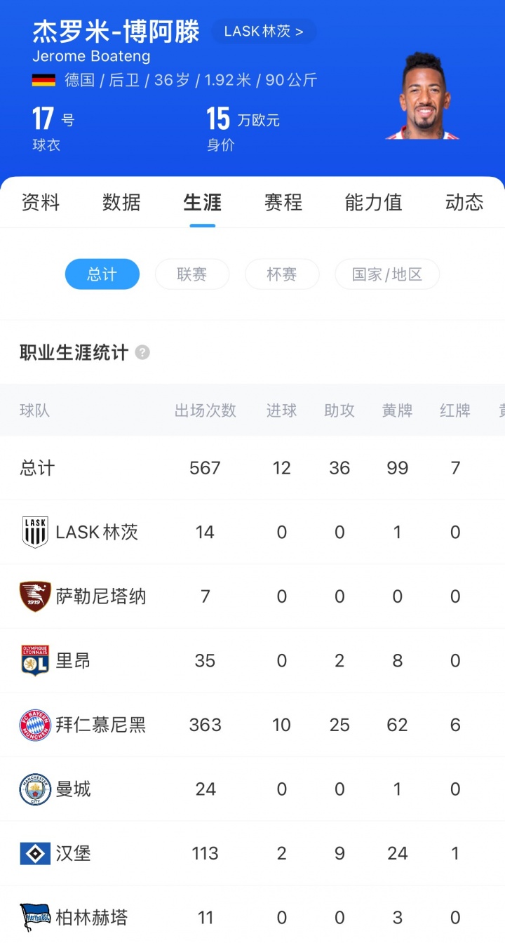 36岁的博阿滕上赛季为林茨出场14次,策画444分钟,他当前的身价为15万欧。